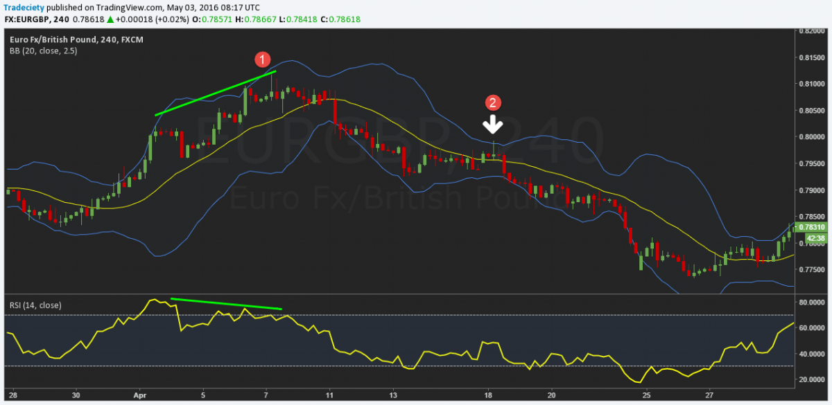 После движения по тренду цена не достигает внешней полосы и ослабевает. Этот сигнал обычно сопровождается дивергенцией с RSI >> Сигнал продолжения