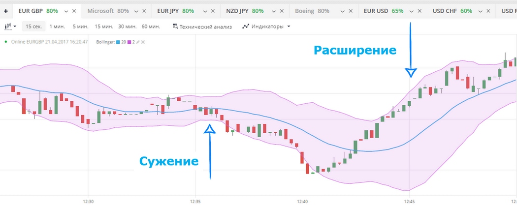 В ситуации, когда на бирже начинаются серьезные волнения, которые характеризуются повышением волатильности (повышенной изменчивости) котировок актива крайние линии Боллинджера имеют тенденцию к расхождению. То есть происходит расширение ценового канала. Зачастую такие изменения являются предвестниками нового мощного тренда.