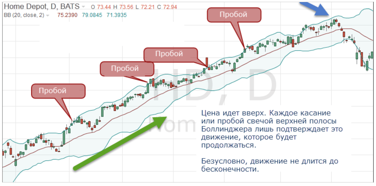 Во время сильных трендов цена находится близко к внешней ленте (полосе)