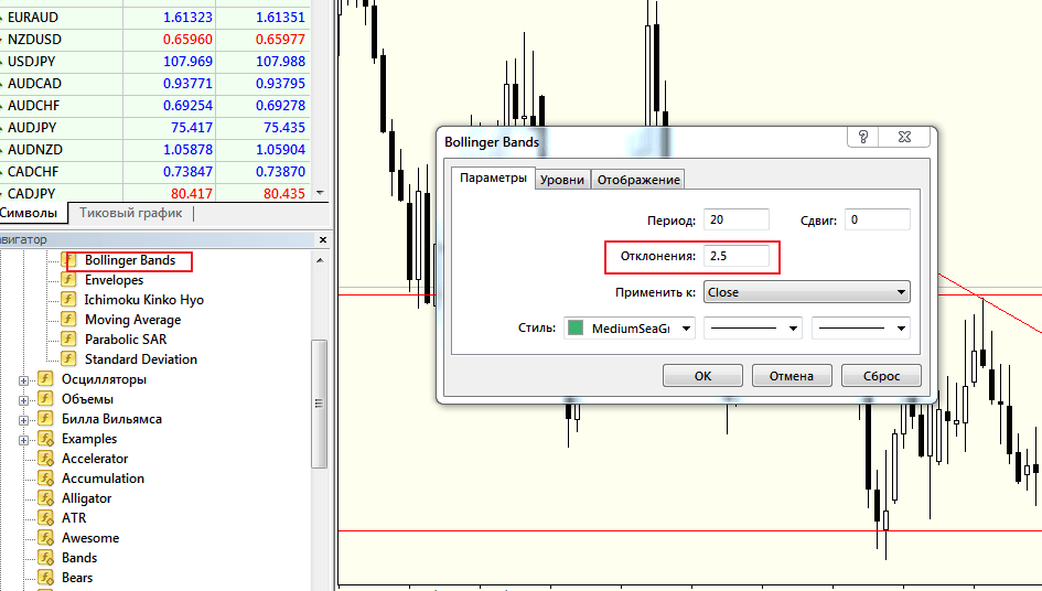 - Для первого индикатора Bollinger bands отклонение SD равно двум. Остальные параметры оставьте стандартными.