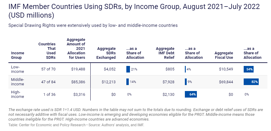 Страны со средним уровнем дохода — 47 из 84 — воспользовались своими СДР. На конвертацию ушло 14% СДР, на погашение долга — 9%, на «фискальные нужды» — 82%