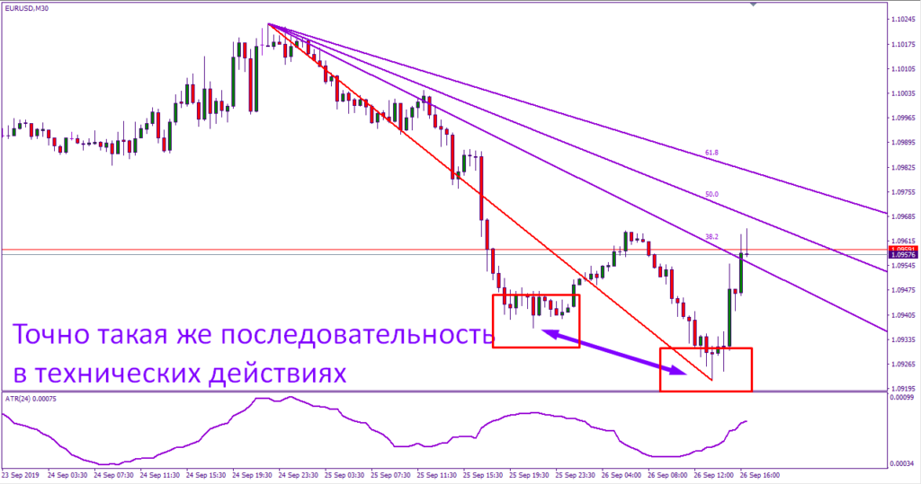 Да. На этом скриншоте мы видим, что у нас была возможность взять некоторое нисходящее движение от примерного ценового уровня 1.09645, то есть, от ещё тогда, выставленного луча веера с параметром в 50%! Но постоянно присущая проблема в том, что мы не знали где выходить, хотя это уже тема для другого материала… А здесь мы наблюдаем, как последовательно перестраивается базовая линия фибо веера.