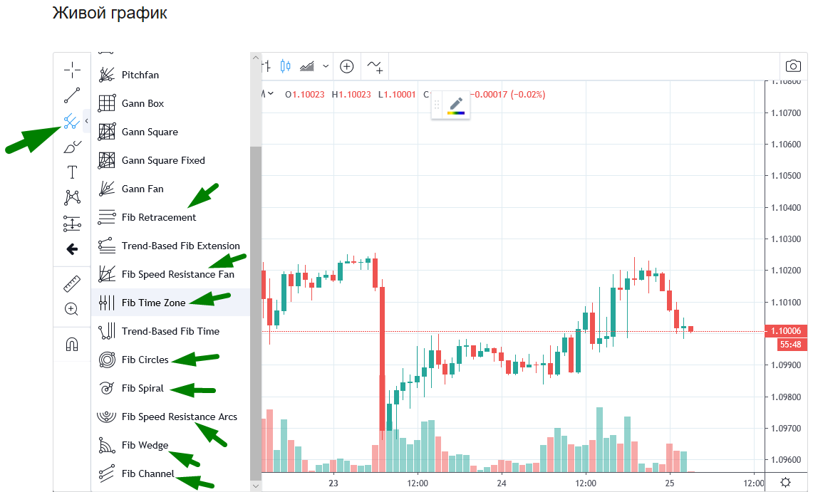 Обратите внимание! Добавить сетку и другие инструменты Фибоначчи можно и на живом графике. Для этого необходимо зайти в программу и нажать указанный значок на панели слева, после чего выбрать нужный вид индикатора