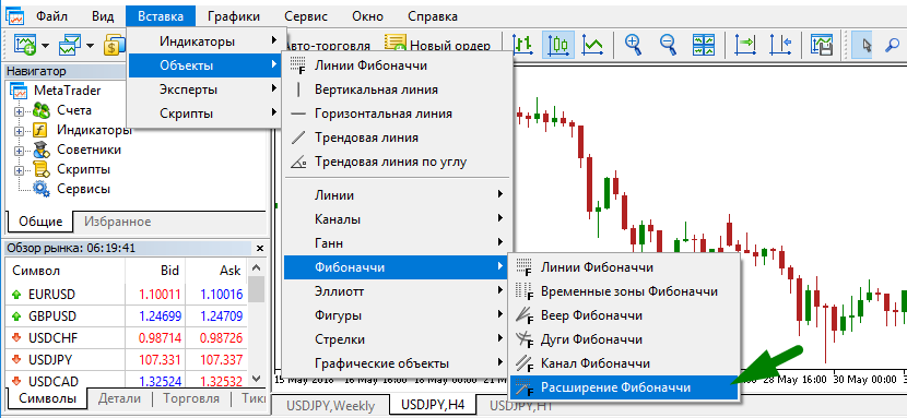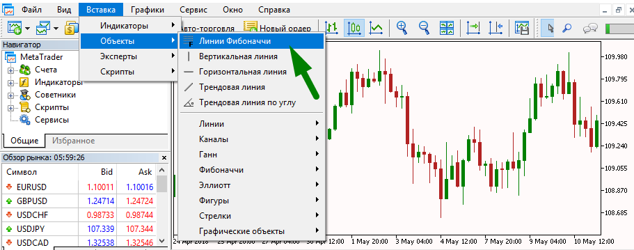 Графический индикатор сетки Фибоначчи есть во всех популярных торговых платформах. Рассмотрим на примере популярного терминала Метатрейдер. Для построения уровней достаточно кликнуть «Вставка» -> «Фибоначчи» -> «Линии», далее на графике провести линию от одной точки до другой, а программа сама наложит уровни: