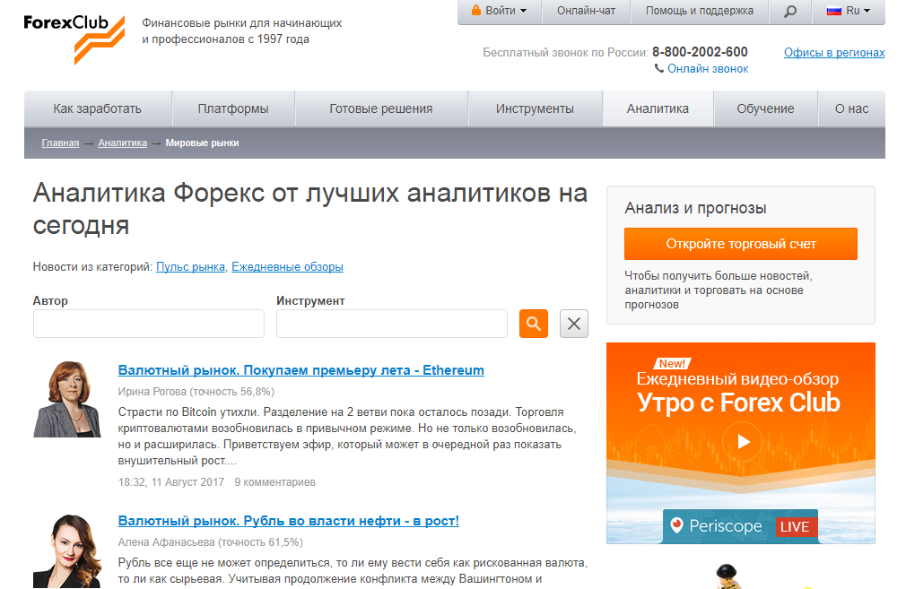 Компания Форекс Клуб уже с 1997 года занимает лидирующие позиции в области предоставления услуг на финансовых рынках. Помимо прекрасной торговой платформы здесь имеется огромный раздел первоклассной аналитики и торговых идей, которые имеют высокий процент прибыльности.