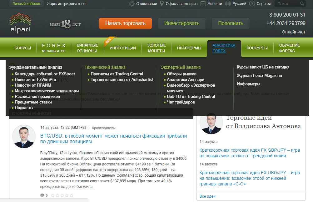 В общем, полный набор для успешной торговли! На наш взгляд, Альпари является не только лидером среди торговли Форекс и Бинарных опционов, но и как аналитический портал с качественным анализом.