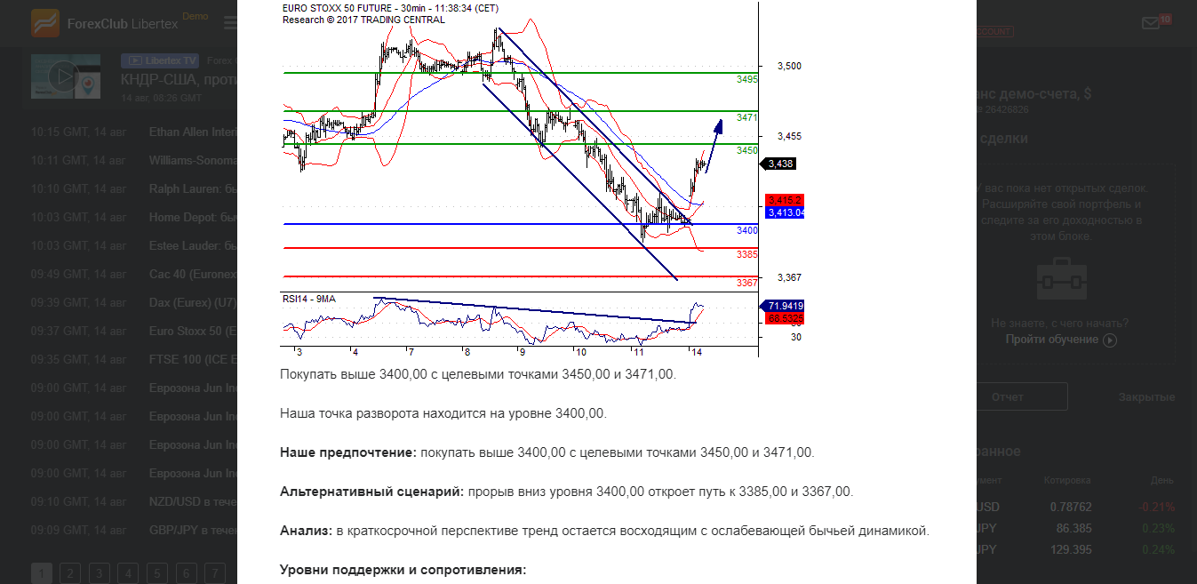 Если зарегистрировать Личный Кабинет, то прямо в терминале Libertex внизу графика вы сможете следить за сигналами и техническим анализом от знаменитых порталов Trading Central и FxWire Pro. Кликнув на интересующий актив, появляется график с торговыми рекомендациями на ближайшее время.