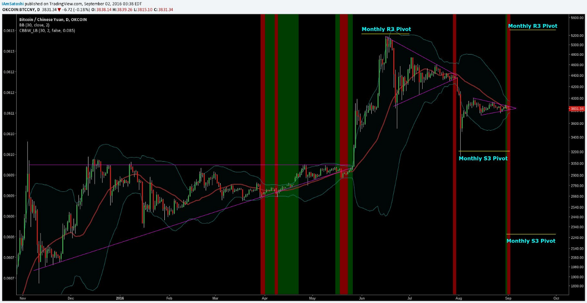 Пивоты также могут использоваться для прогнозирования ценового действия, основанного на движении цены предыдущих движений. Идея здесь заключалась в том, что, если бы цена попала в месячный пивот R3 / S3 с сжатием полосы Боллинджера, то сделала бы это снова.