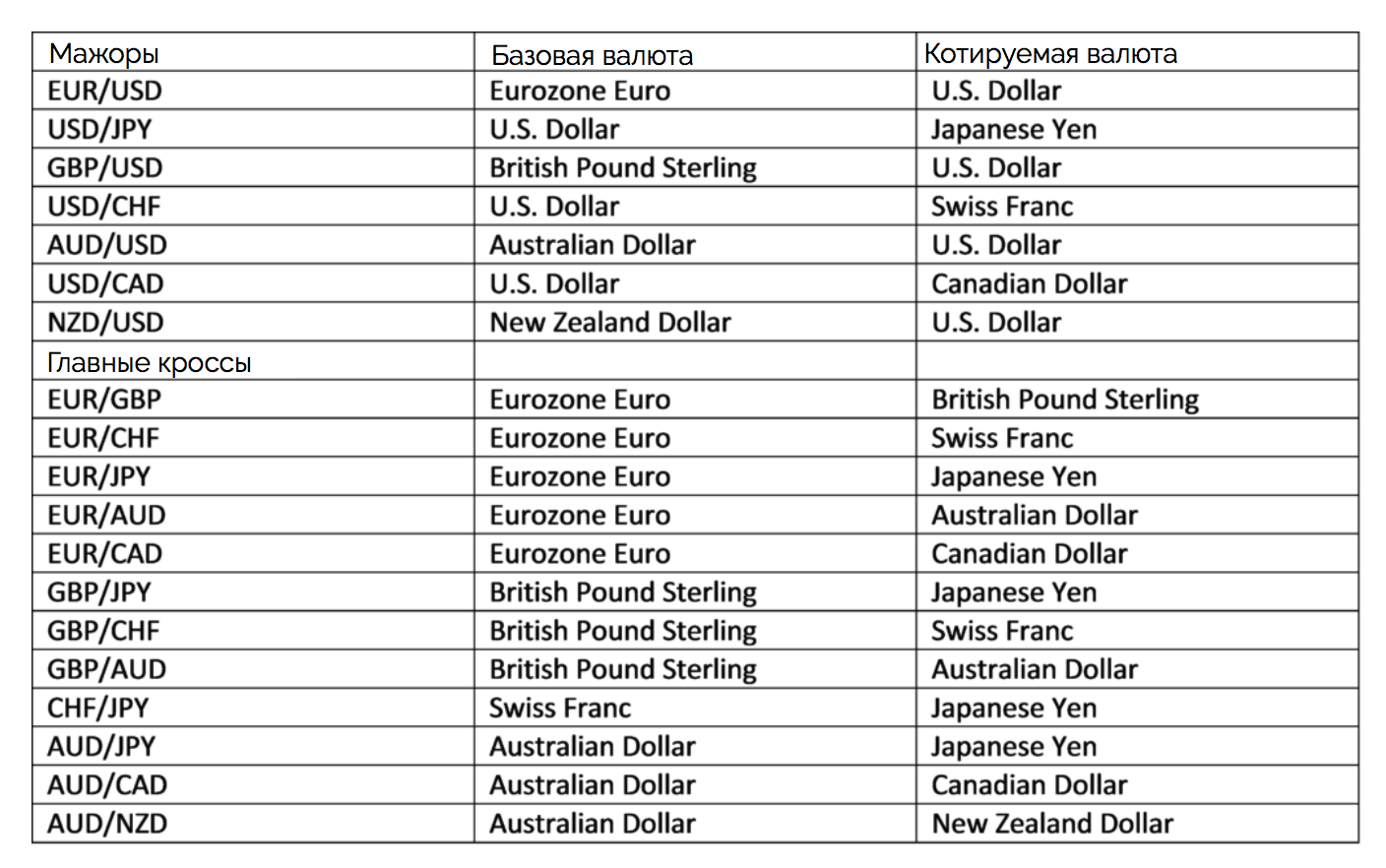 В следующей таблице сначала перечислены наиболее активные и ликвидные валютные пары с участием доллара США.