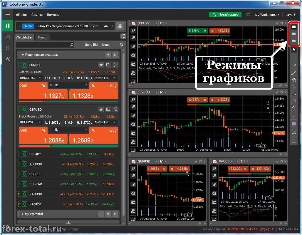 Три различных режима графиков позволяют по-разному расположить их в рабочей области. Вы можете выбрать несколько графиков, один график или режим Free-Chart.