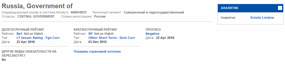 Отсюда видно, что долгосрочный рейтинг России по обязательствам в иностранной валюте обозначен как Ba1, т.е. стоит как раз на грани инвестиционной и спекулятивной категории. Краткосрочный рейтинг при этом не определен, указанный прогноз — негативный, что достаточно сильно расходится со стабильным прогнозом от S&P (хотя оба сделаны в 2016 году с разницей примерно в полгода).