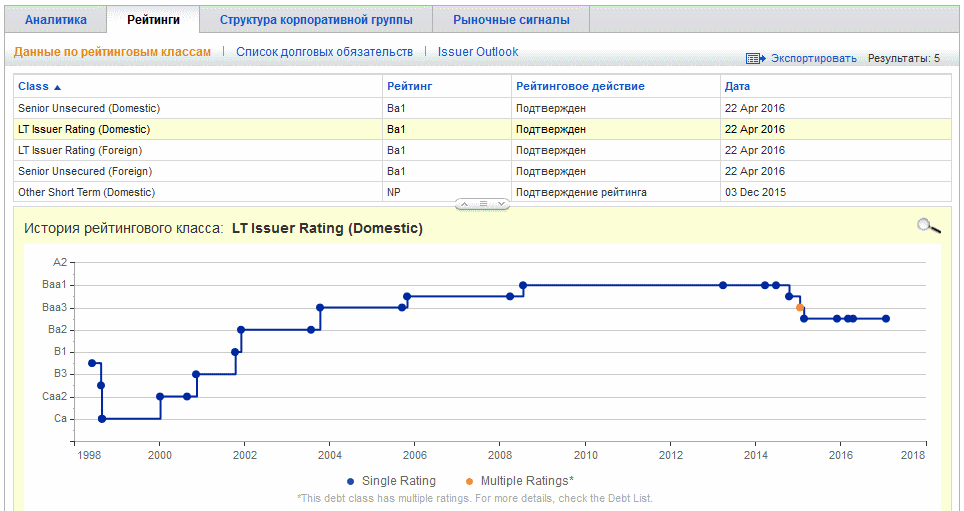 Итого, несмотря на множество оценочных параметров, рейтинги являются относительно субъективными. Однако у Moody’s удобным показателем является просмотр рейтинговой истории эмитента, для чего нужно переключиться на вкладку «Рейтинг»: