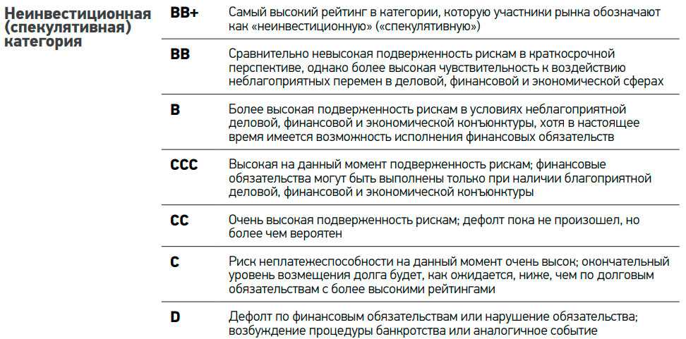 «CCC» — обязательства по ценным бумагам выполняются, дефолт представляется реальной возможностью. Способность выполнять финансовые обязательства целиком зависит от устойчивой и благоприятной деловой или экономической конъюнктуры.