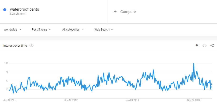 Водонепроницаемые брюки за последние 5 лет сильно выросли в поисковых запросах. Предсказывая вышеуказанную тенденцию, можно предположить, что поисковые запросы будут продолжать расти.