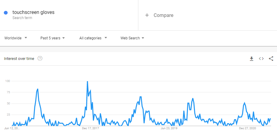 Одним из самых больших недостатков ношения перчаток зимой является то, что вы не можете пользоваться сенсорным экраном своего телефона. Именно поэтому приведенная выше тенденция показывает такой резкий рост числа поисковых запросов в зимние месяцы.