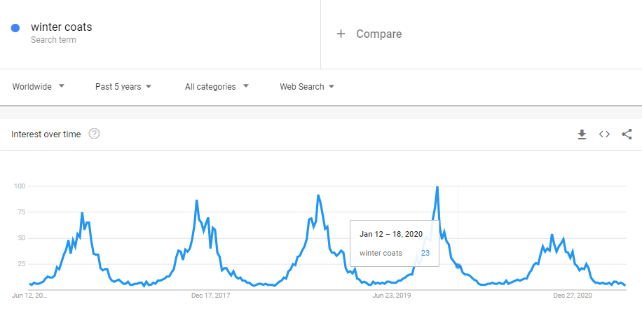 Зимние пальто следуют предсказуемой тенденции, когда они, очевидно, становятся товаром повышенного спроса в зимние месяцы. Нацельтесь на этот товар и постарайтесь продать его как можно больше в период высокого спроса.