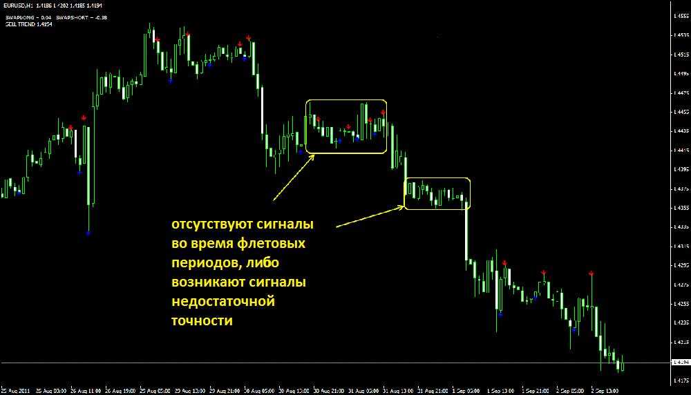 Есть недостаток – при флетовом движении сигналы немного запаздывают. Но, в любом случае, программа свои функции выполняет. Причем для отфильтровки сигналов можно использовать дополнительные индикаторы, отслеживающие тренд, например, MACD или Alligator. В этом случае как минимум половина ложных сигналов будет отсеиваться, что обязательно положительно отразиться на эффективности торговли.