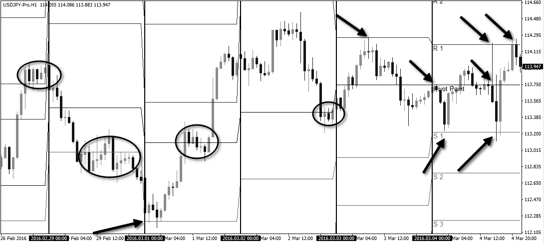 Кружки показывают моменты, когда цена консолидируется в области точек разворота. Стрелки показывают моменты, когда цена находит поддержку или сопротивление возле отмеченных уровней.