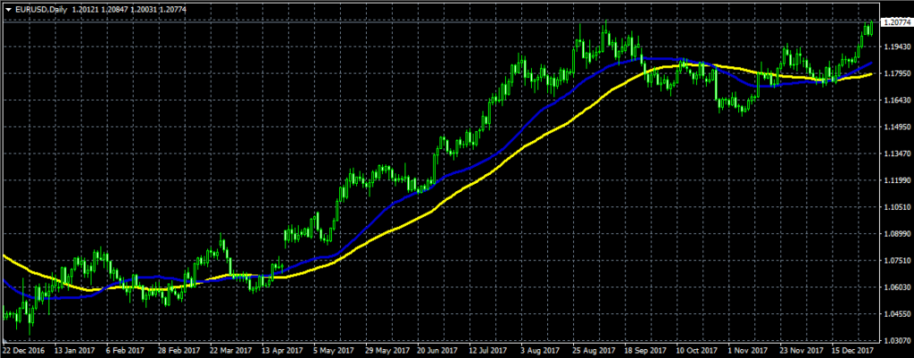 Сигналы этого типа используется скорее как фильтр для определения приоритетного направления движения графика. Если торговать только по ним, то соотношение стопа к тейк-профиту будет далеким от идеального. К моменту получения сигнала от МА уже назревает коррекция на первое движение после разворота.