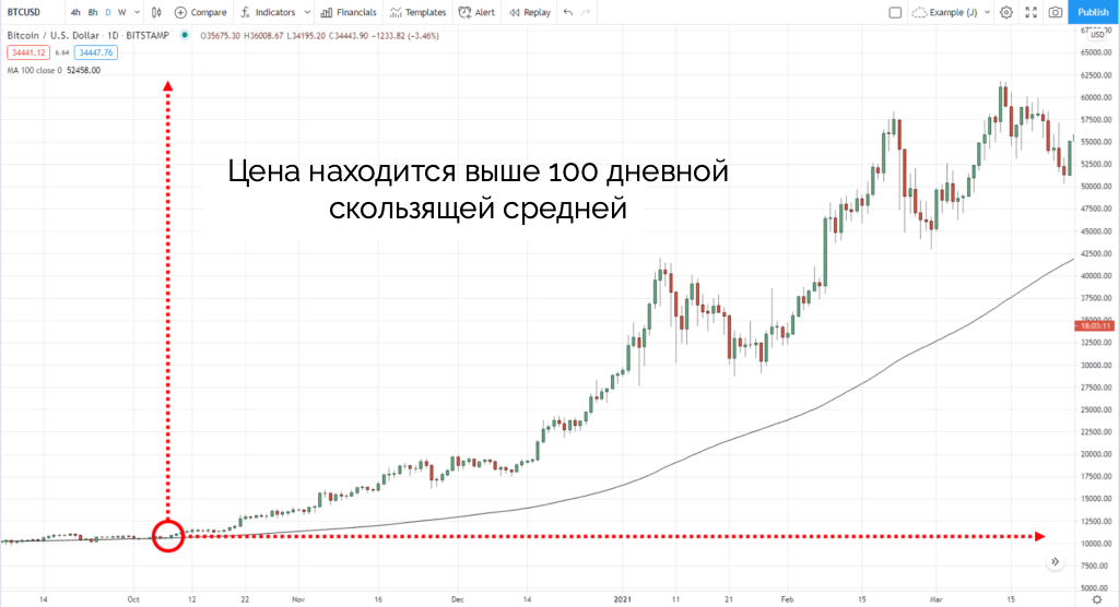 Скользящая средняя — это индикатор, следующий за трендом, потому что он «следует» за ценой. Это означает, что если цена пойдет выше, скользящая средняя тоже пойдет вверх (и наоборот). Итак, как вы можете использовать 100-дневную скользящую среднюю для торговли по тренду?