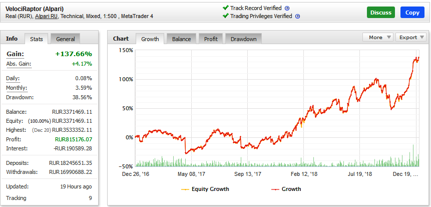 Это, на первый взгляд, отличный график. Постоянный рост депозита. Нет убыточных сделок. За 4,5 месяца заработано без малого 4100%. В год, теоретически, с суммы 100 тысяч рублей можно заработать более 4-х миллиардов рублей, а за два года, с учётом сложного процента, получаются и вовсе фантастические цифры. Я даже не буду писать, так как не знаю, как правильно называть такие числа.