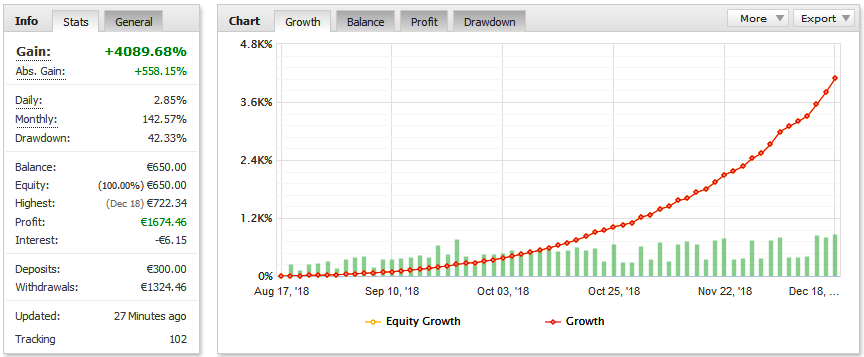 Поэтому, он делает это постоянно, не пытаясь заработать миллионы. Трейдер вложил 300 Евро, а вывел 1324 Евро. Если бы он не выводил деньги, то сейчас текущий депозит уже равнялся бы 12569 Евро. Но трейдер не рассчитывает на чудо, предпочитая постоянно выводить прибыль.