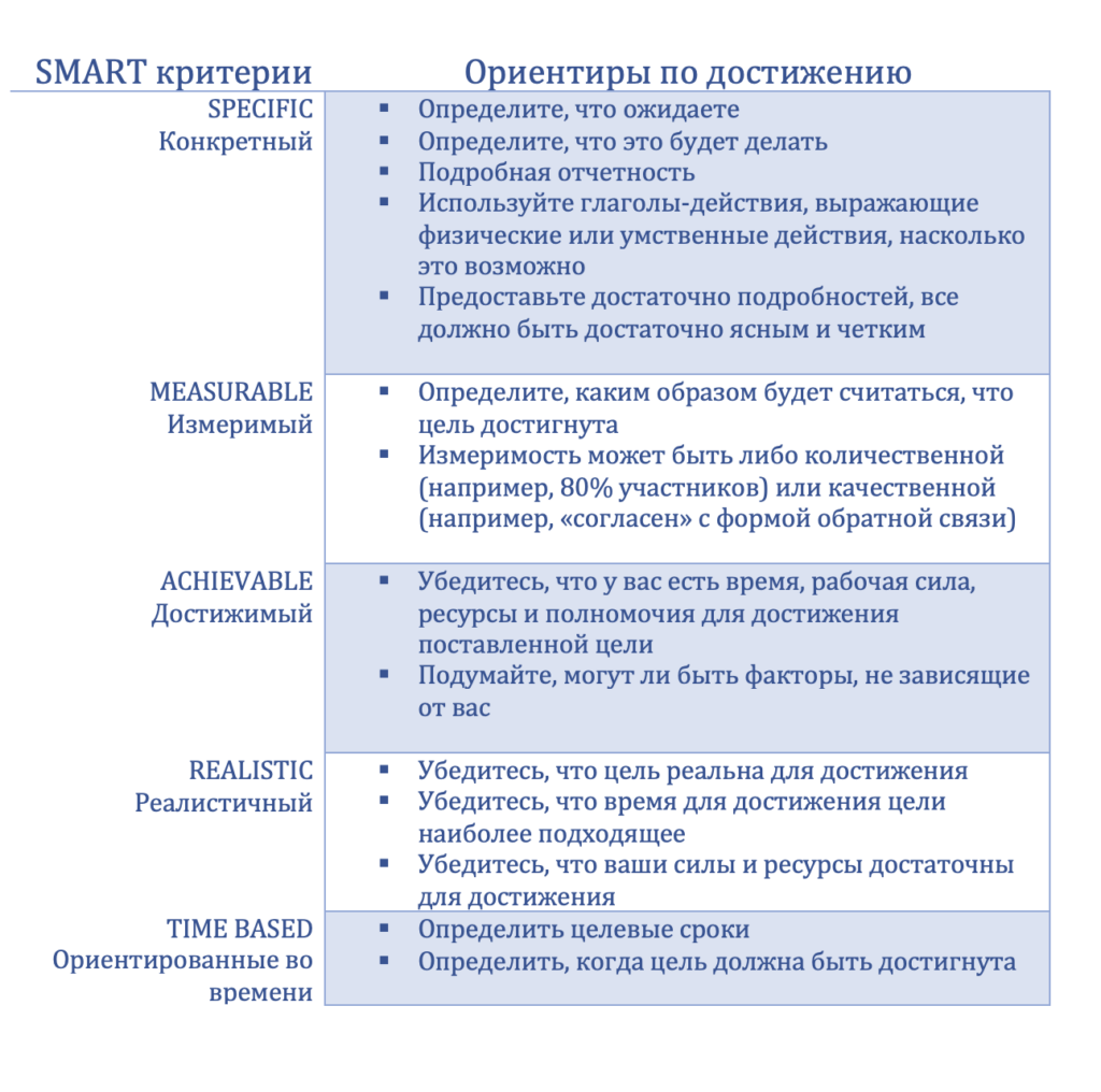 Для того, чтобы ваши цели были четкими и достижимыми, каждая из них должна соответствовать следующим критериям: