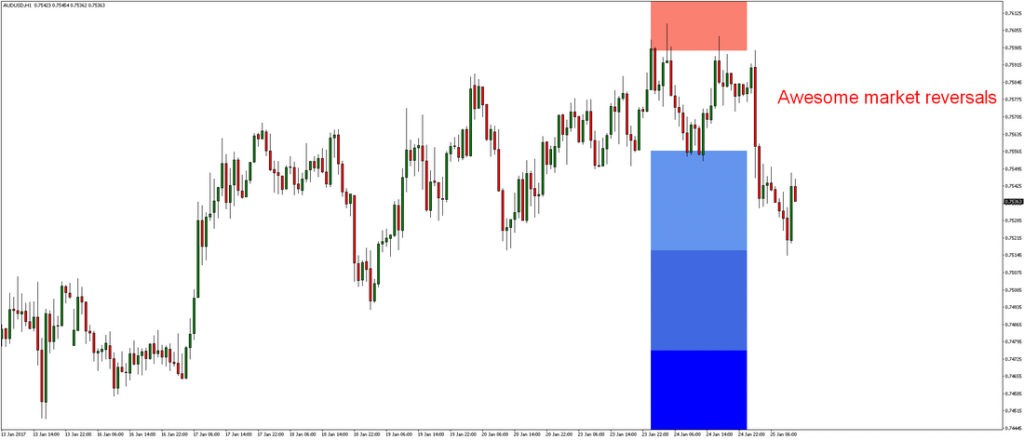 На приведённом ниже графике вы можете увидеть, как два пин-бара отскакивают от красной зоны продаж HFT, а свеча поглощения отскакивает от синей зоны покупки HFT.