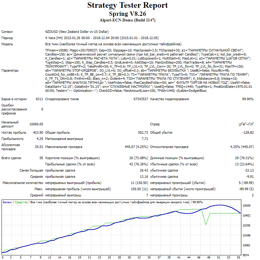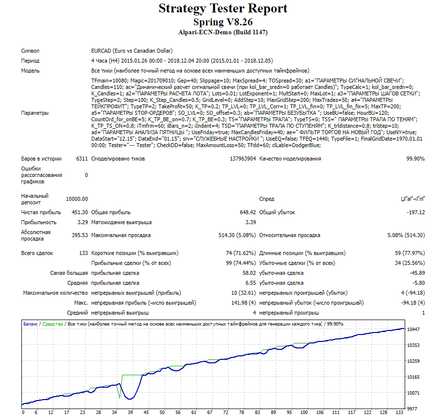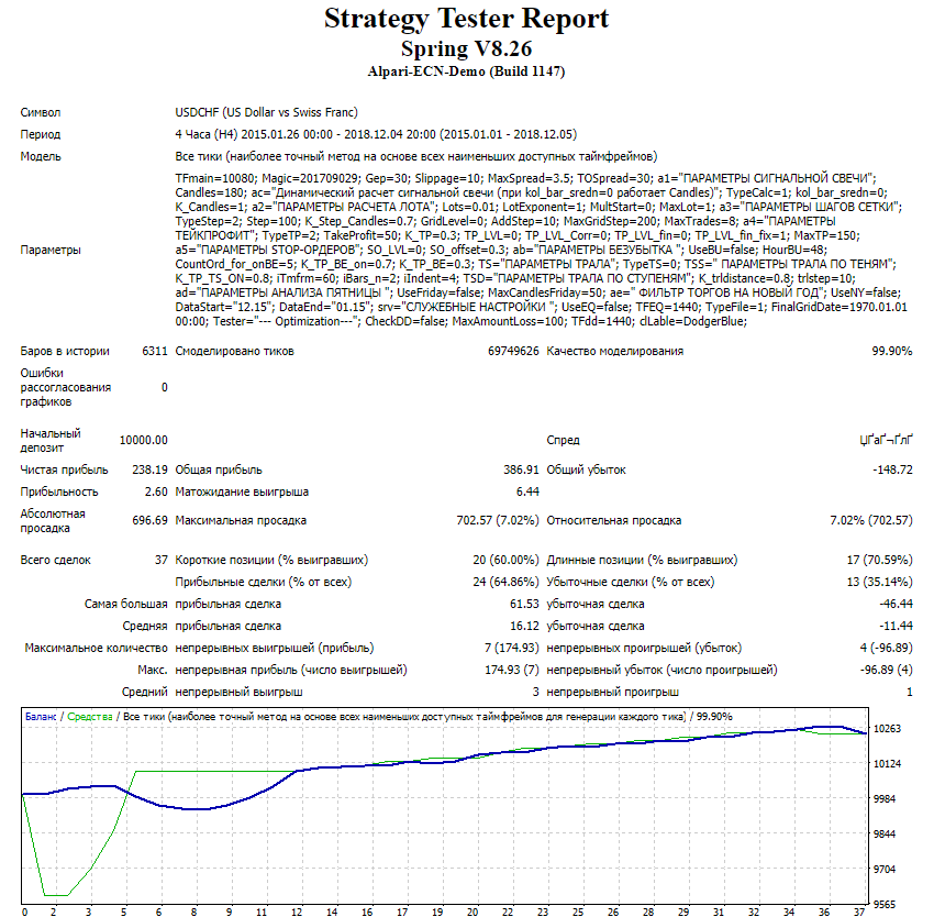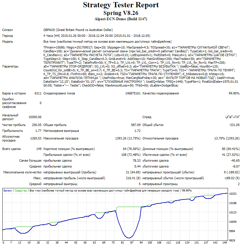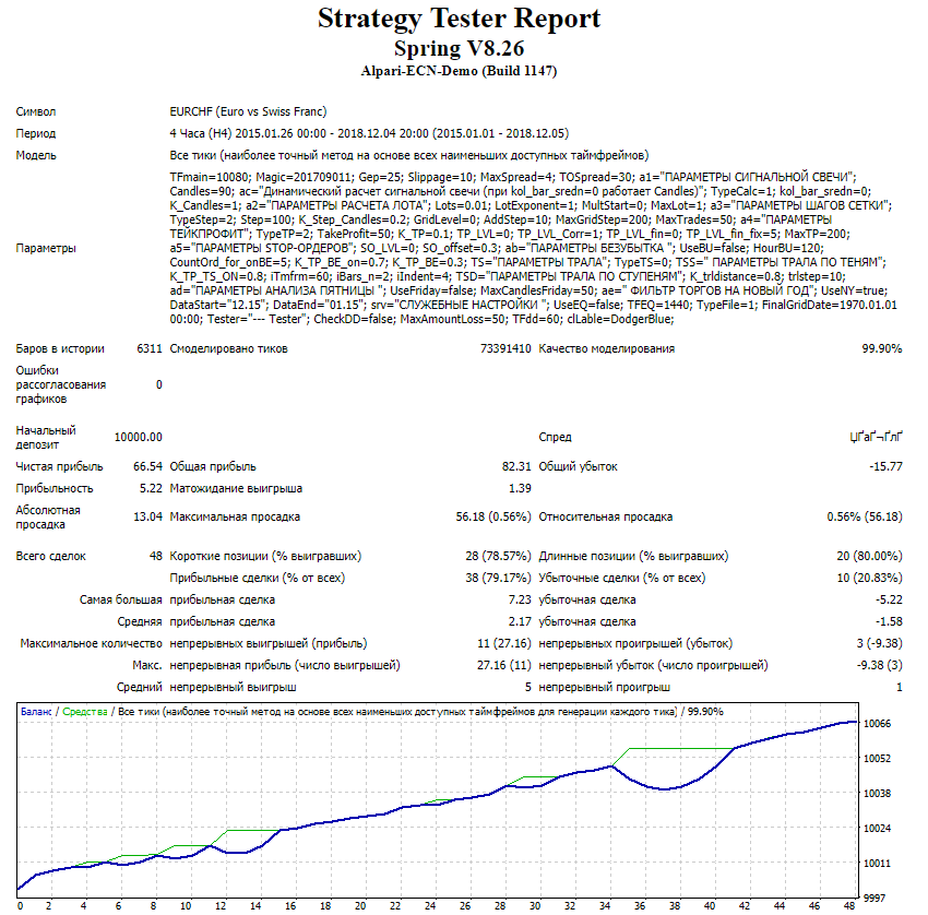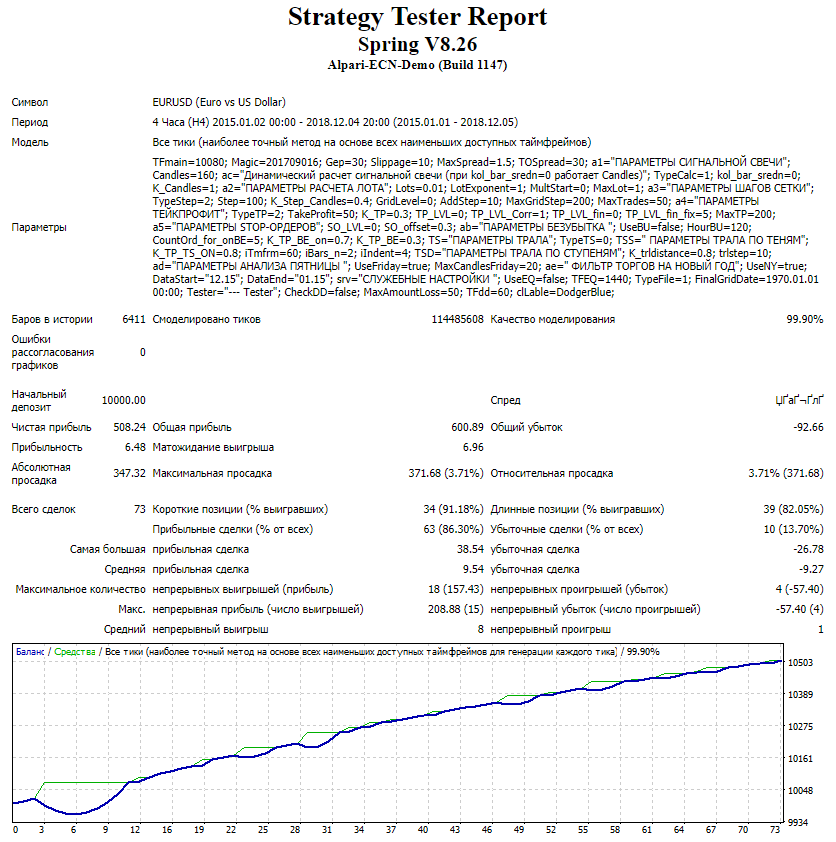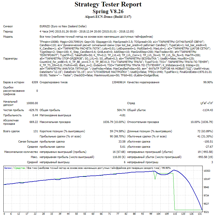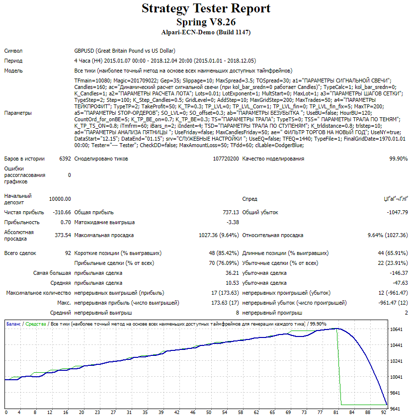 Перед установкой на счет любой советник (особенно потенциально опасный, как Spring) необходимо протестировать, чтобы выявить подходящие настройки и проанализировать полученные результаты. Это поможет вам выявить устаревшие или неприемлемые для вас сеты, убедиться в правильном выборе брокера, рассчитать подходящий мани менеджмент. Лучше всего проводить тесты на максимально полном периоде исторических данных, предварительно проверив качество ваших котировок и подкачав недостающие данные. Кроме того, не забывайте выставлять реалистичный уровень спреда, учитывая также и проскальзывания, которые обязательно будут.