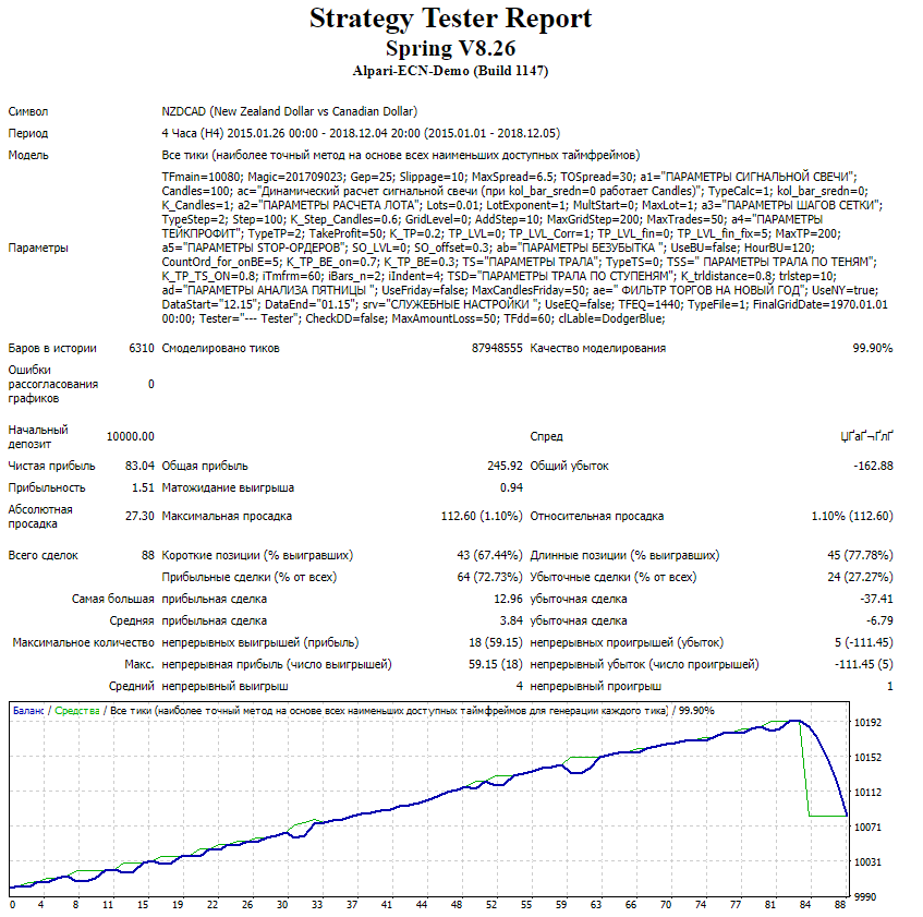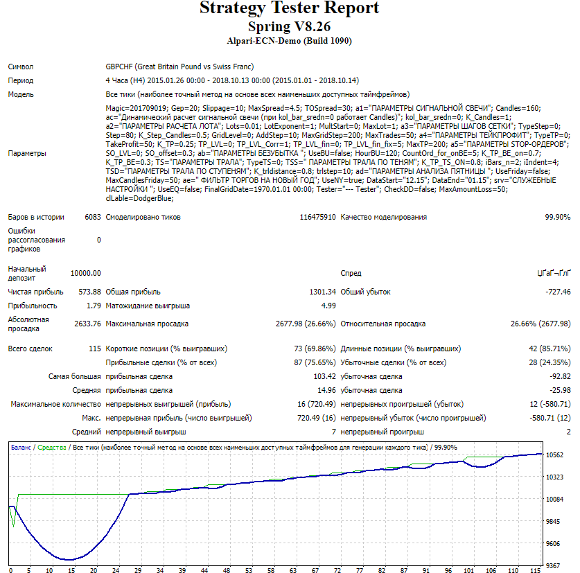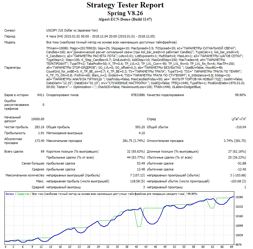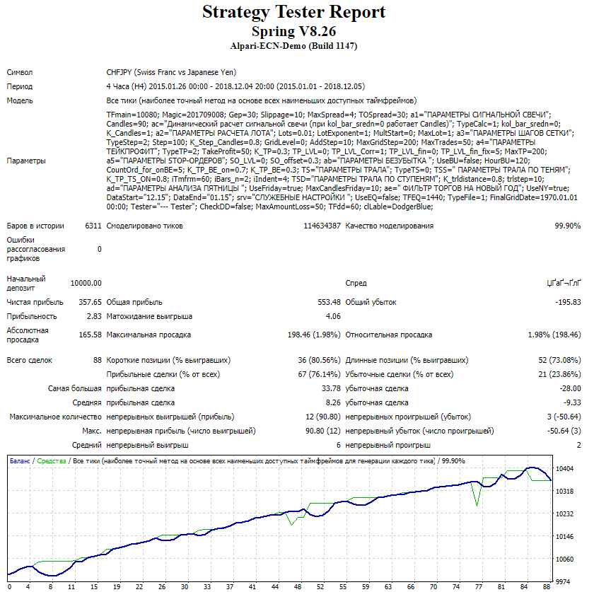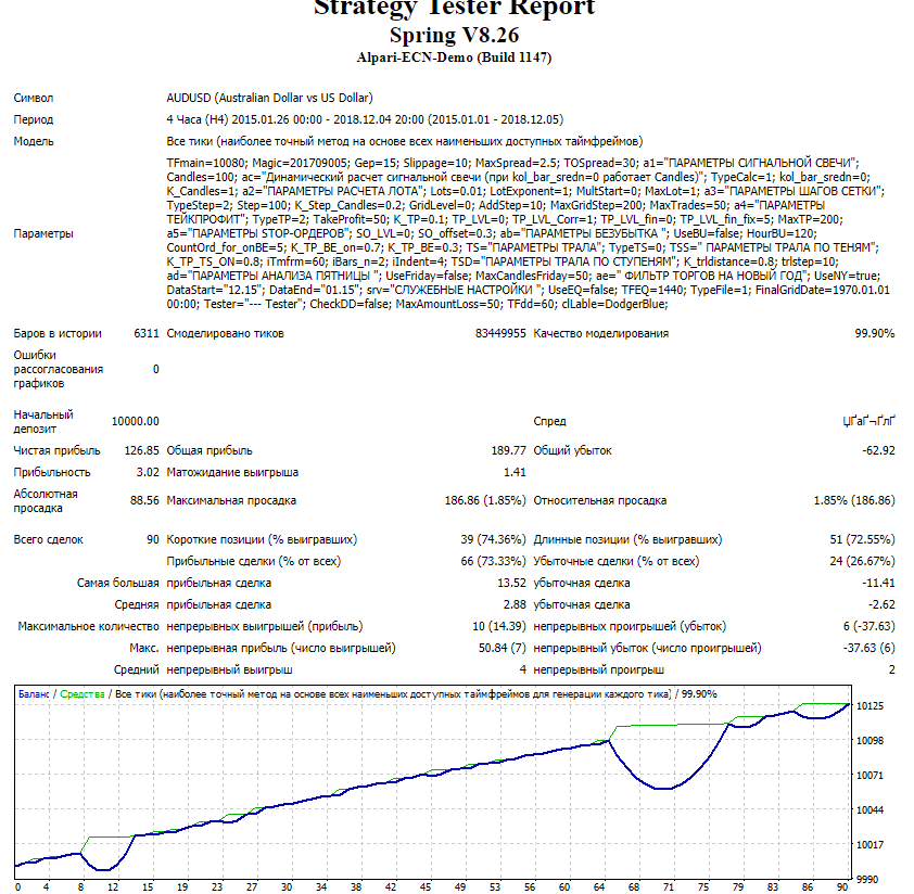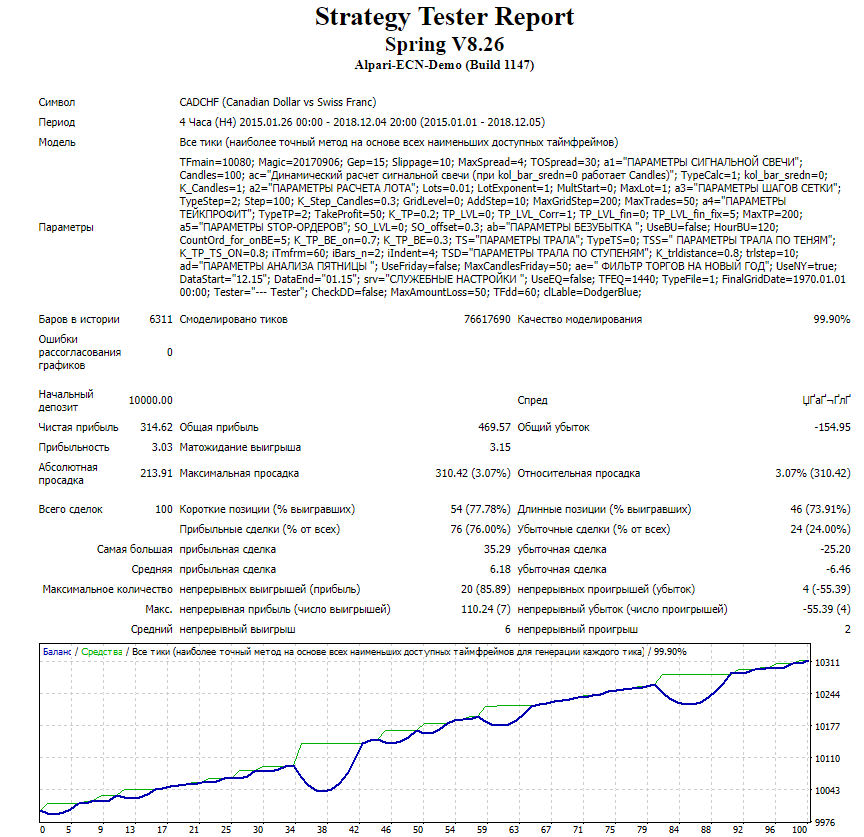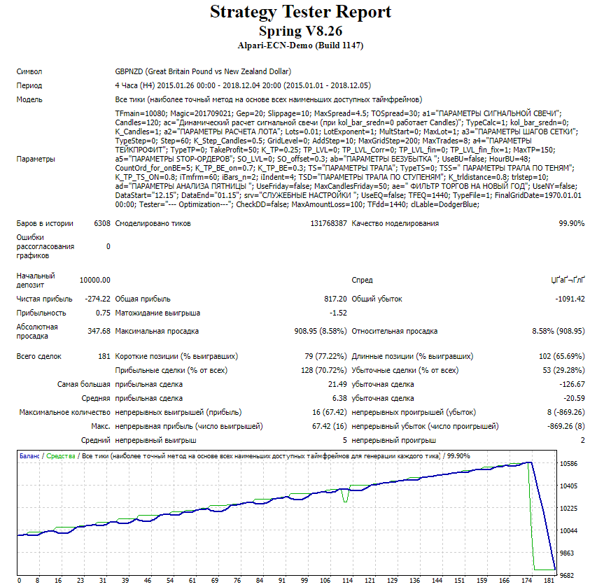 Перед установкой на счет любой советник (особенно потенциально опасный, как Spring) необходимо протестировать, чтобы выявить подходящие настройки и проанализировать полученные результаты. Это поможет вам выявить устаревшие или неприемлемые для вас сеты, убедиться в правильном выборе брокера, рассчитать подходящий мани менеджмент. Лучше всего проводить тесты на максимально полном периоде исторических данных, предварительно проверив качество ваших котировок и подкачав недостающие данные. Кроме того, не забывайте выставлять реалистичный уровень спреда, учитывая также и проскальзывания, которые обязательно будут.