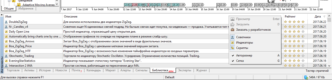 Для того, чтобы бесплатно скачать робота с библиотеки MT4, открываете терминал и в самом подвале, нажимаете кнопку «Библиотека». По умолчанию будет сразу отображаться: Советники, Индикаторы и Скрипты. В этой статье мы говорим о советниках, значит отключаете все и видите только список советников которые уже внесены в библиотеку.