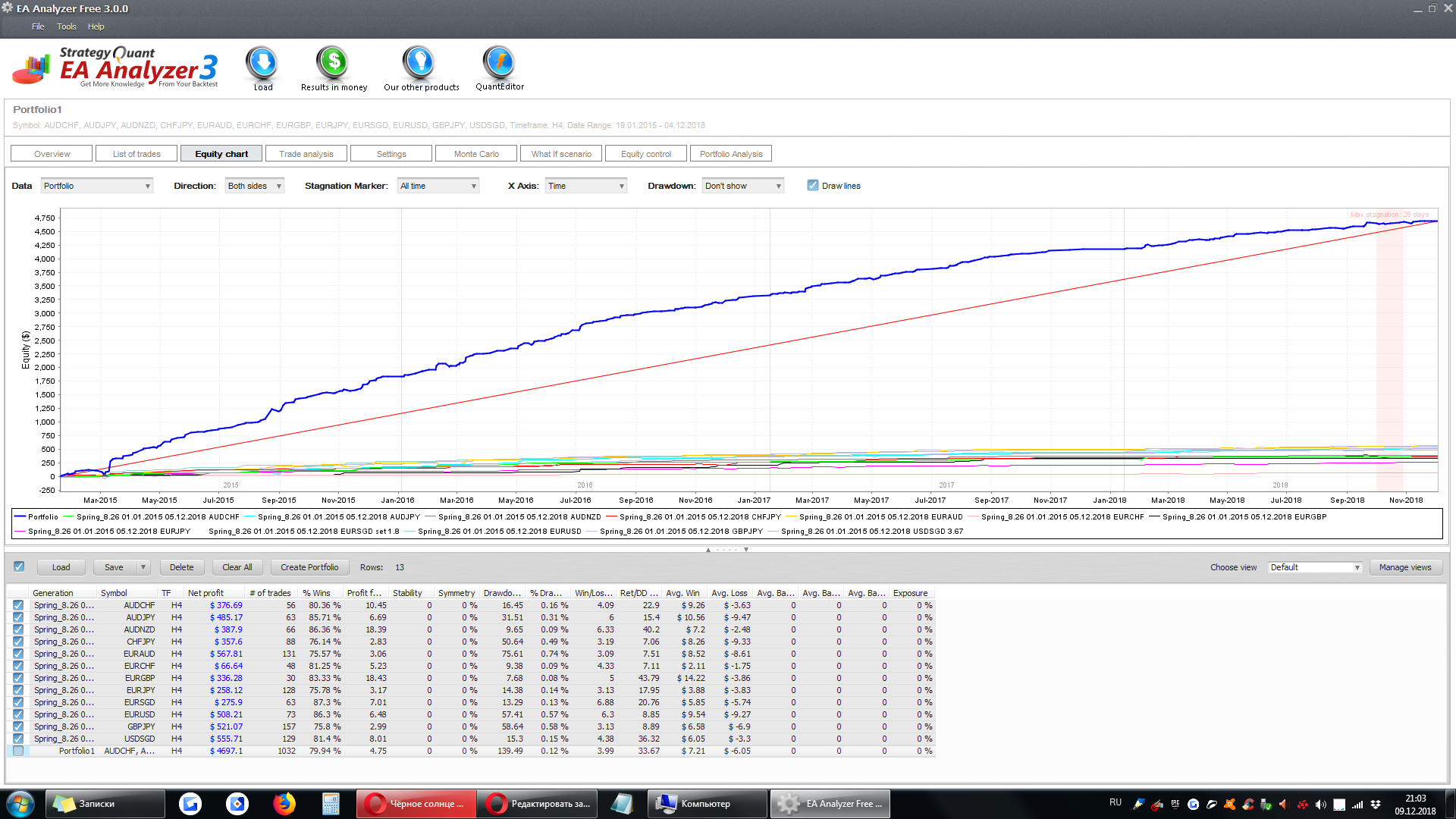 Для визуального сведения полученных стейтментов в один график и оценки суммарной просадки полученного портфолио используем программу EA Analyzer.