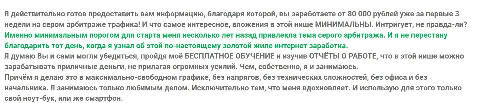 Соната занимается тем, что продает курсы по заработку на онлайн-казино и гемблинге. Вся работа в обучении строится на привлечении мотивированного, а не естественного трафика. Такая схема обычно быстро распознается партнерками, после чего личный кабинет арбитражника блокируют вместе со всеми заработанными деньгами.