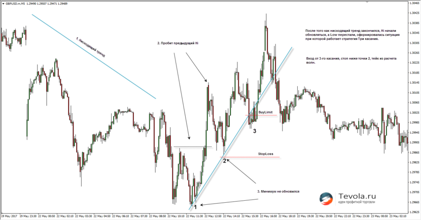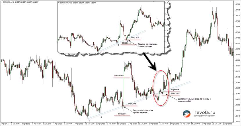 Полностью стратегия Третье касание описана в статье Трендовая стратегия | Вход на 3-ем касании.
