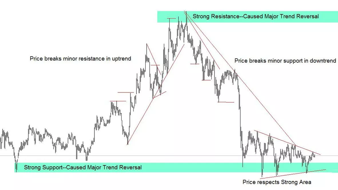 Minor support and resistance levels don’t hold up. For example, if the price is trending lower, it will make a low, then bounce, and then start to drop again. That low can be marked as a minor support area, because the price did stall out and bounce off that level. But since the trend is down, the price is likely to eventually fall through that minor support level without much problem.