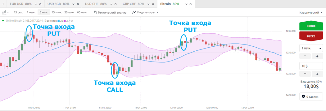 Проще говоря, трейдеру следует покупать бинарный опцион Call, когда зеленая свеча пробивает границы верхней линии. Позиция Put соответствует обратному положению вещей, при котором красная свечка выходит за границы нижней линии.
