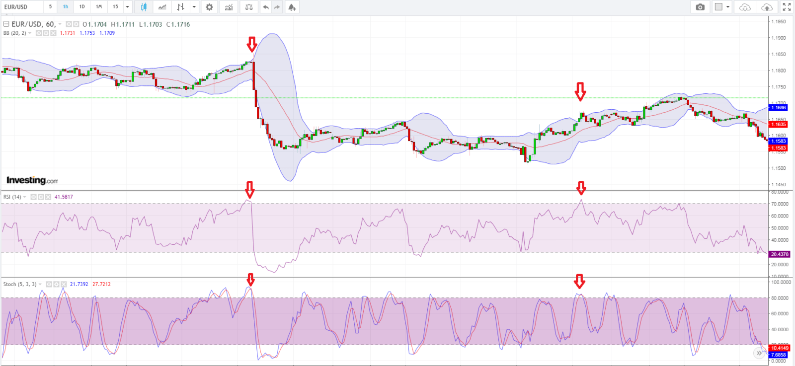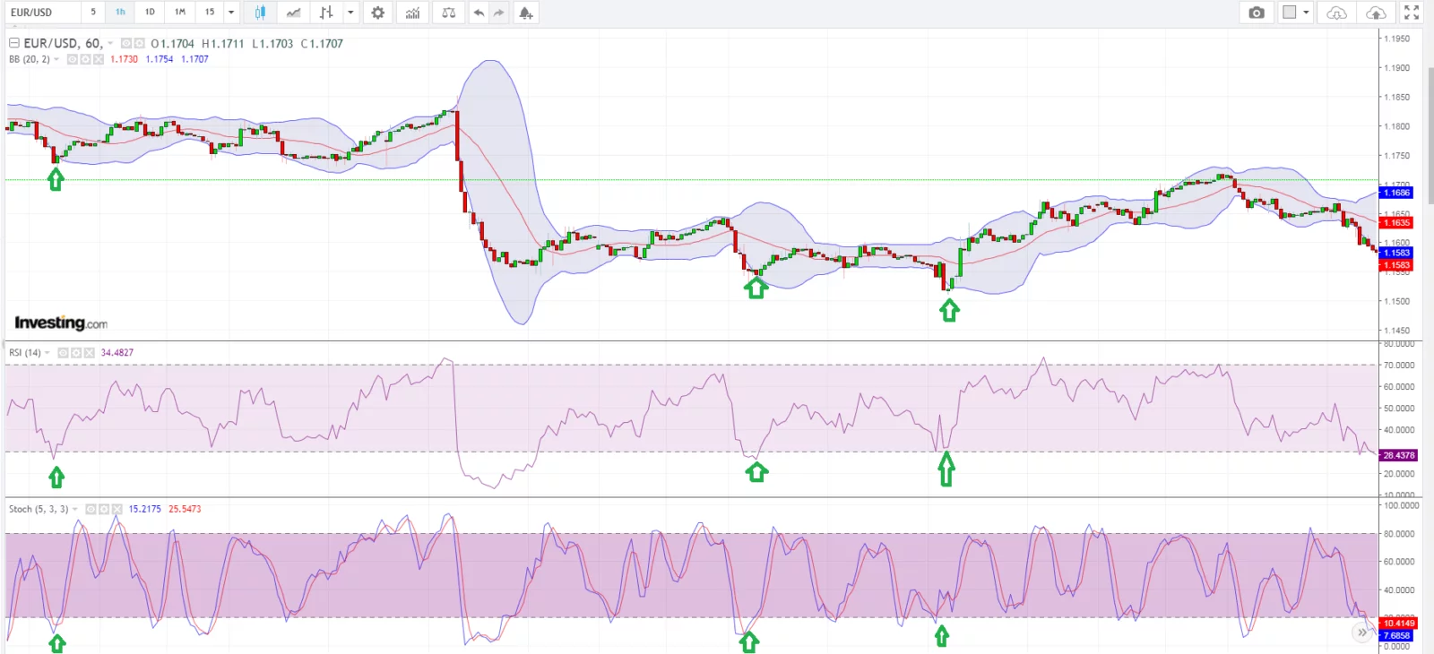 - Используемые индикаторы: BB (20/2), RSI (14), Stoch (5/3/3).