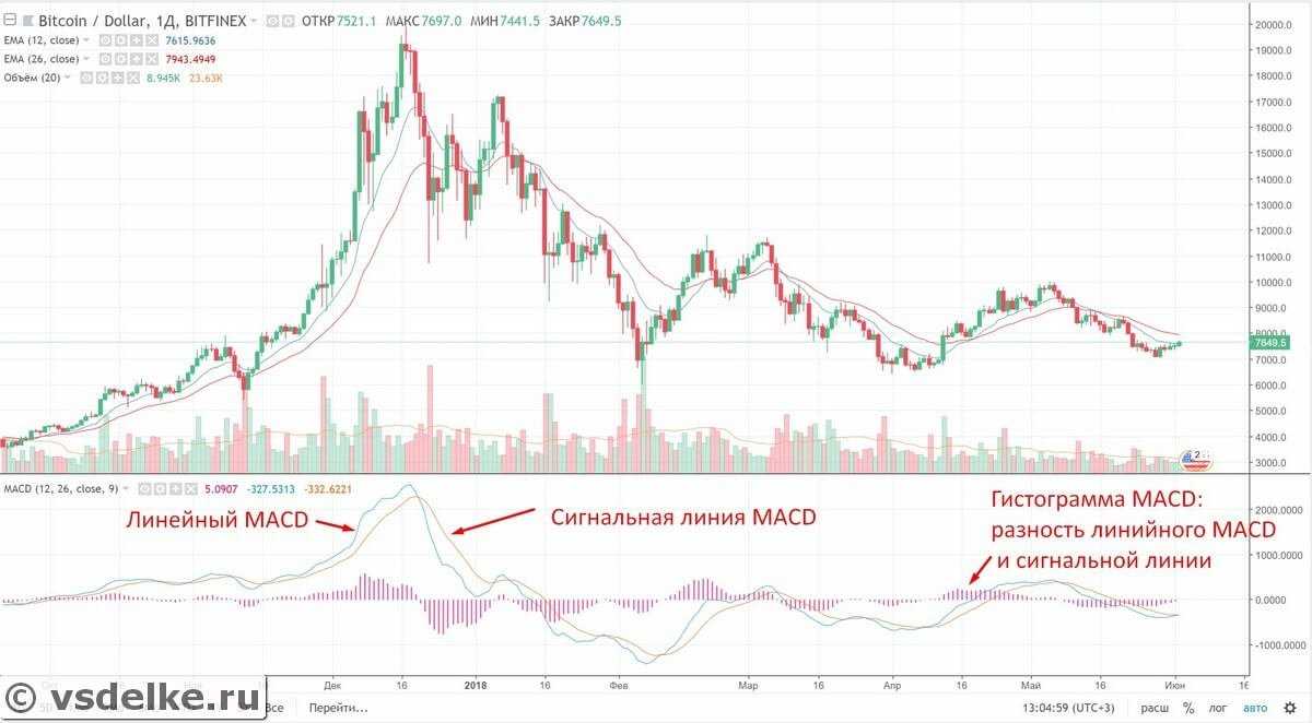 Особенно мощным сигналом разворота тренда считается дивергенция (в переводе означает «расхождение»). Это ситуация, когда цена идет в одном направлении, а гистограммы MACD – в противоположном, т. е. показания индикатора и реальный график криптовалюты расходятся в разных направлениях и как бы противоречат друг другу.