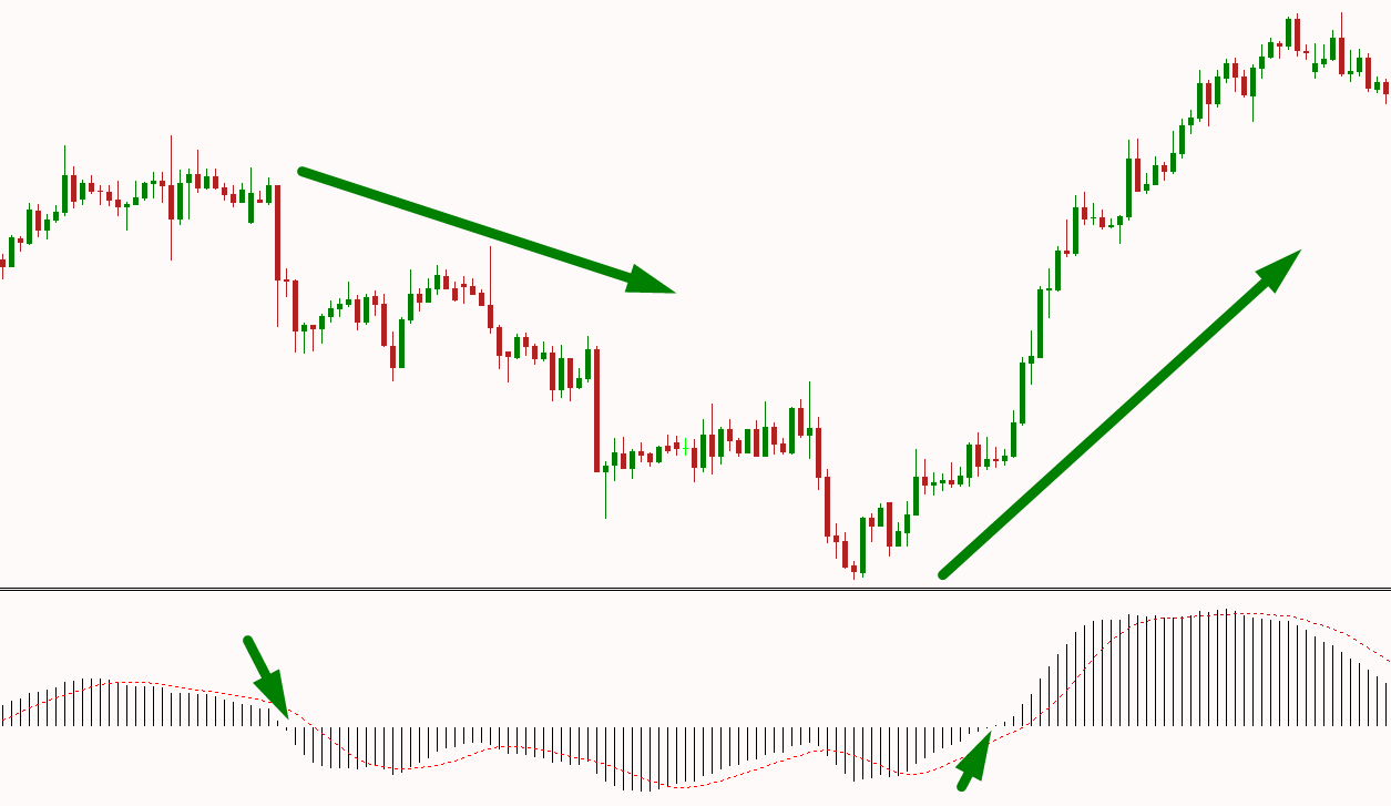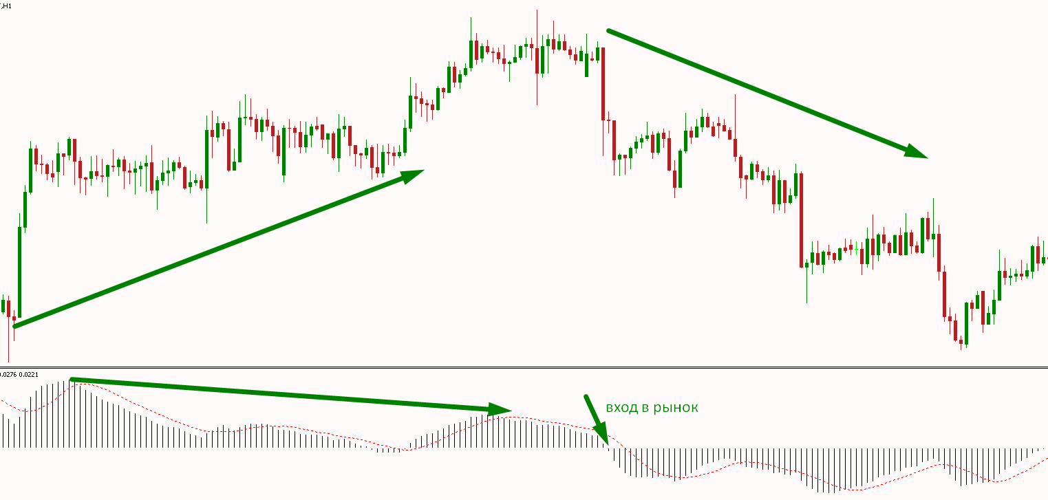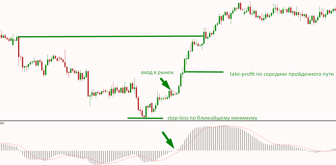 Главный сигнал, который дает этот осциллятор – пересечение линией и гистограммами нулевого уровня: