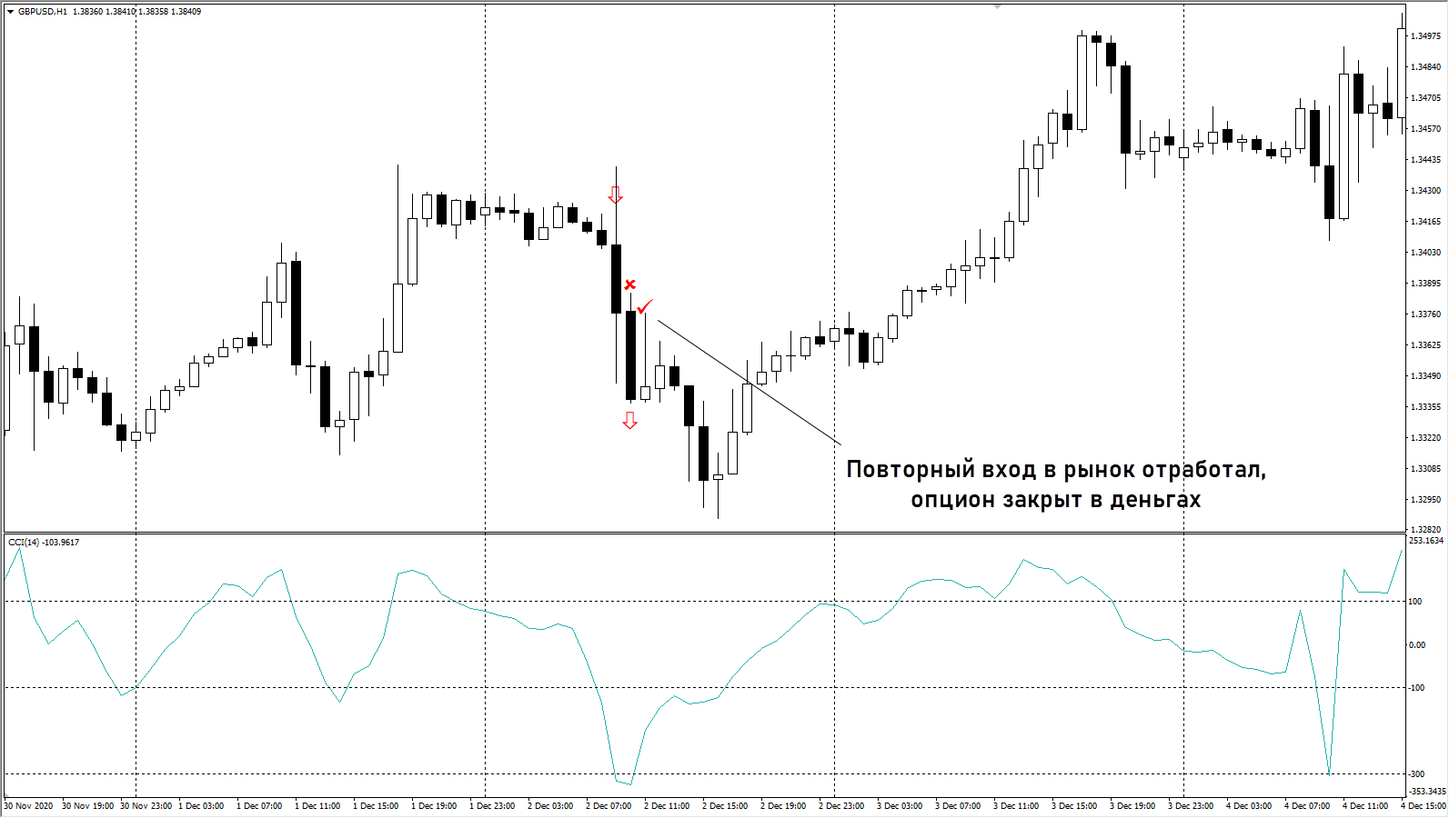 Еще один индикатор без перерисовки для бинарных опционов, при работе с БО на первый план выходит способность CCI указывать на импульсы. На этом явлении построен ряд торговых стратегий, в них ставка делается на то, что после импульса следует откат длиной как минимум в 1 свечу.