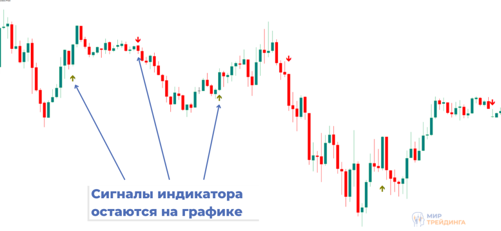 Несмотря на то, что данный технический инструмент не перерисовывает свои значения, входить в сделку нужно только после окончательного закрытия сигнальной свечи, над которой появилась стрелка. Ведь пока свеча не закроется, то стрелка может исчезнуть.