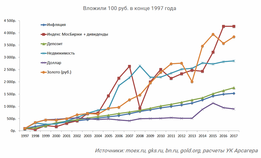 В ежегодном выражении акции всех стран в состоянии обыгрывать инфляцию примерно на 5%, что на дистанции обеспечивает солидный капитал благодаря сложному проценту. Другие графики на тему инвестиций и цифры доходностей вы можете найти в этой статье.
