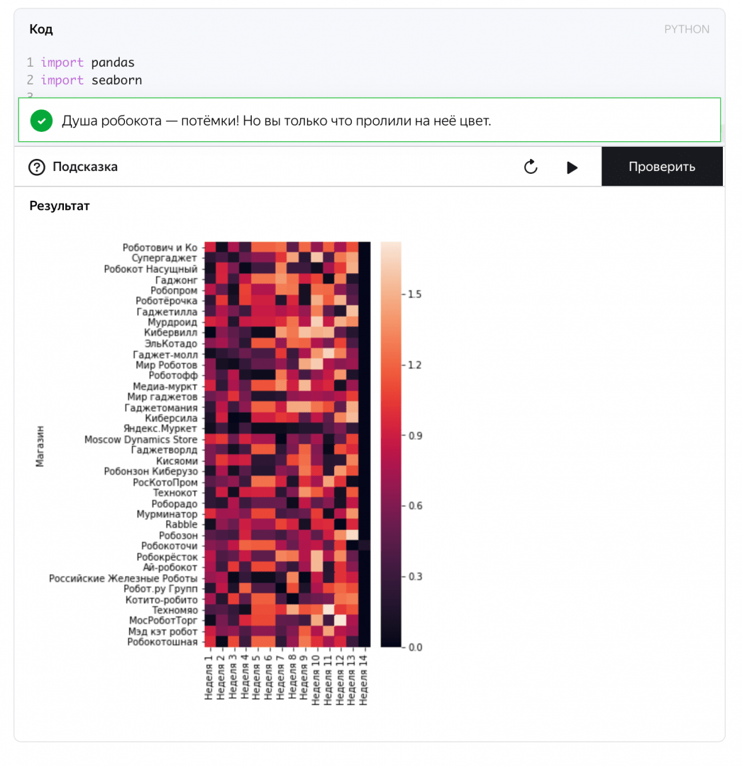 Вспомним пример из Практикума: здесь тепловая карта показывает распределение возвратов товара по неделям для разных компаний. Красные и белые квадраты — много возвратов, чёрные — мало. Видно, что меньше всего отказов у Яндекс Муркета, а больше — у Робокотчи и Мурдроида. А ещё по какой-то причине в 14-ю неделю возвратов нет ни у кого, и это странно — нужно разбираться, действительно ли это так.