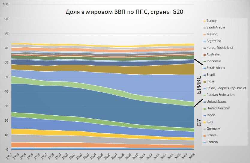 Взяв долю в мировом ВВП по ППС стран G20 с сайта МВФ, получается следующая картина: если в начале 1990-х страны G7 давали около половины мирового ВВП, то в 2018 г — лишь 30%, причём БРИКС их уже в этом опережает.