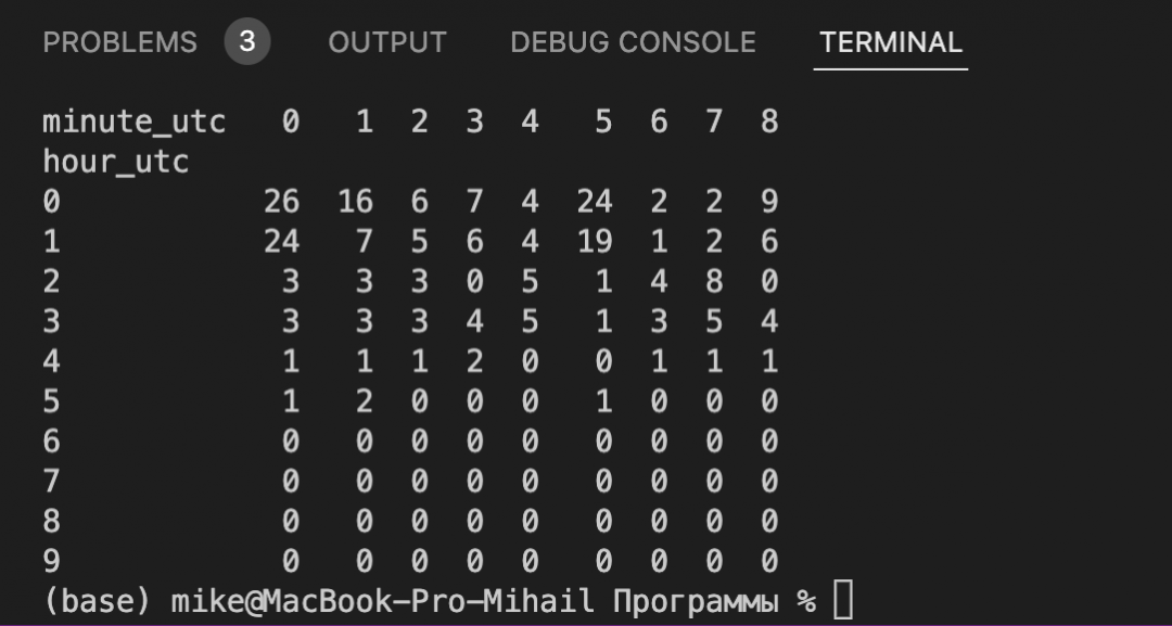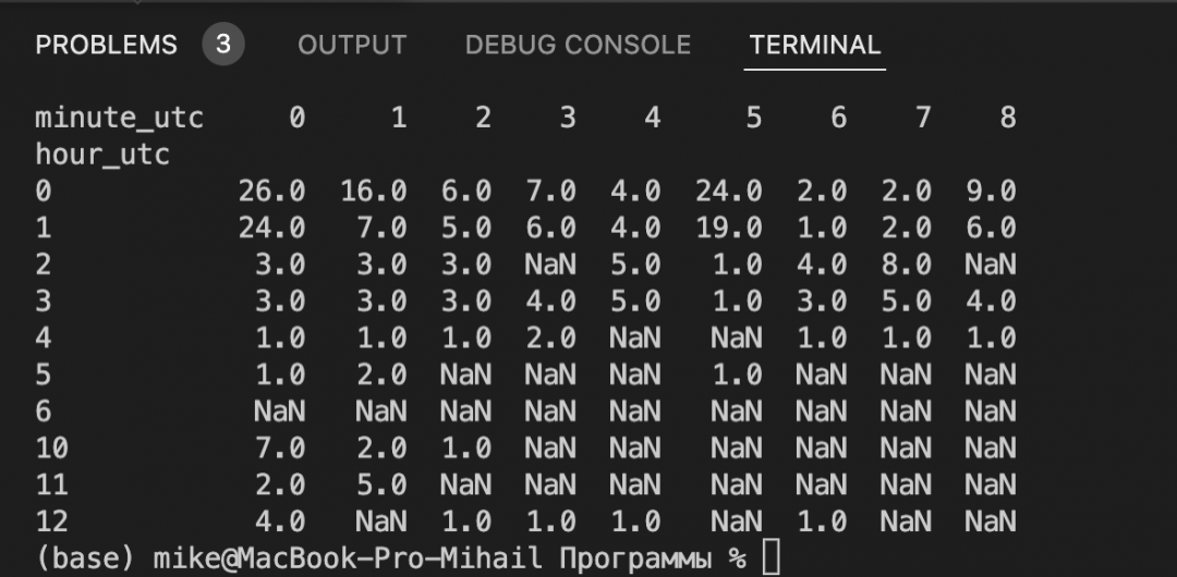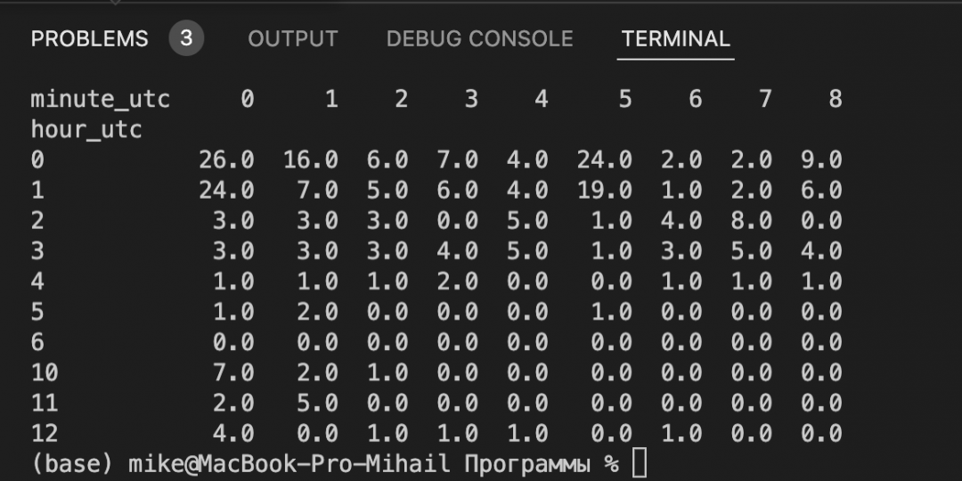 Нули появились, но нужно решить ещё одну проблему: у нас нет минут 7, 8 и 9, а ещё, может быть, нет минут, которые не вошли в тестовый вывод. Всё потому, что в исходном датасете не было записи о том, что в это время публиковались твиты. Это может исказить тепловую карту, поэтому добавим недостающие минуты и часы, а также приведём всё к целым числам: