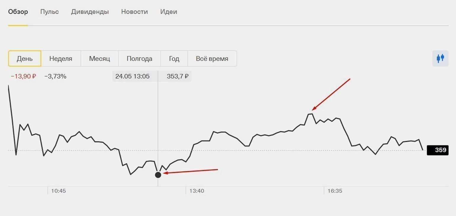 Например, трейдер может купить акции «Татнефти», когда они стоят 353,7 рубля за штуку, а продать через пару часов, когда их стоимость достигла 366,8 рубляСкриншот: «Тинькофф»