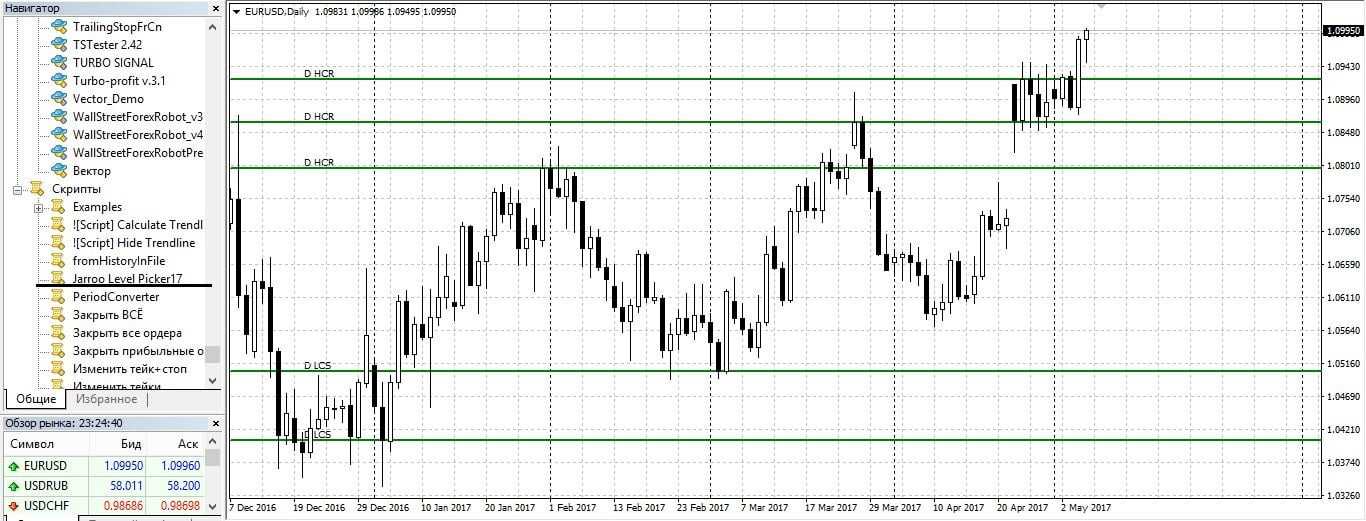 Затем отмечаем только те уровни, где присутствуют не менее двух свечей с практически идентичными ценами открытия/закрытия. Пример построения уровней Jarroo: