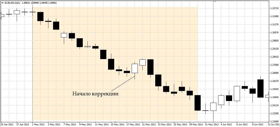 Пример. С конца апреля по конец мая 2012 года на EUR/USD наблюдался ярко выраженный нисходящий тренд. В момент, когда началась коррекция переходим на Н4.