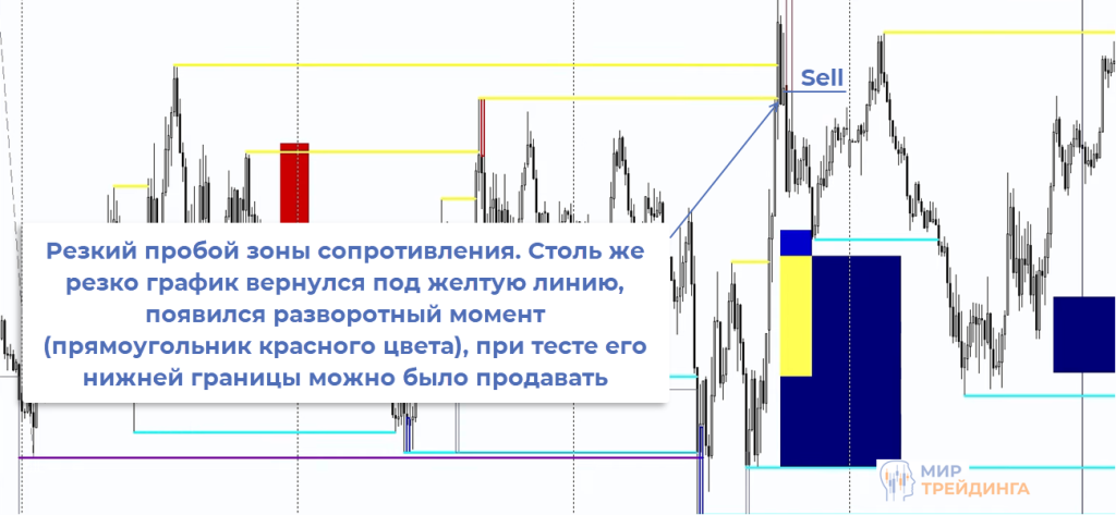 На примере сценария с отбоем от зоны через ложный пробой. Для входа в рынок по стратегии Снайпер должно выполняться несколько условий: