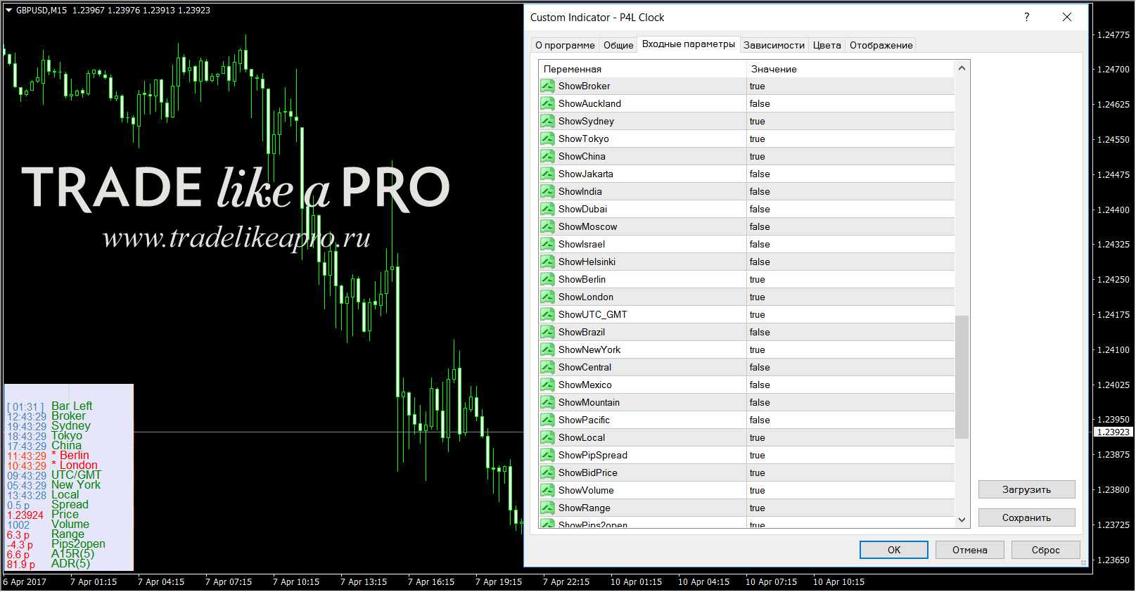 P4L Clock – в этой панели и время, и спред, и ADR и много всего ещё. Особенность индикатора в том, что буквально каждую строчку можно включить/выключить – таким образом мы оставляем только то, что нам надо. Говорить о размещении в любой части графика или любом подвале другого индикатора не стоит – тут это всё реализовано.